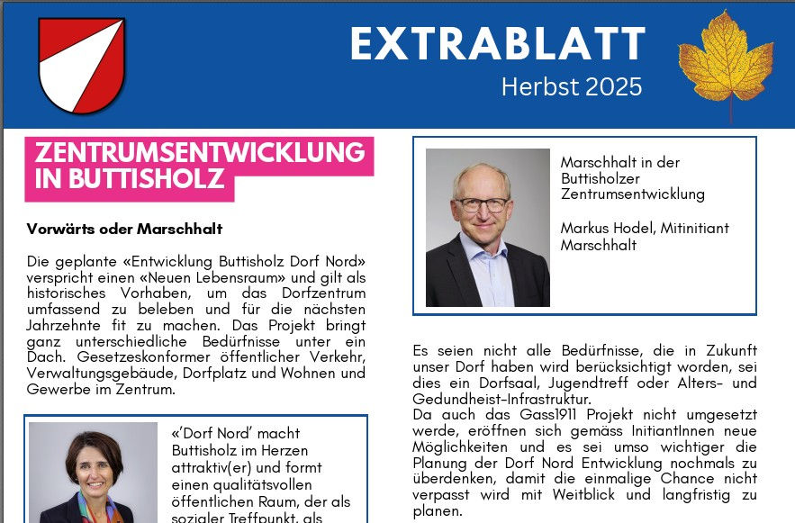 Das Extrablatt informiert über aktuelle Themen der FDP Buttisholz. Hauptfokus ist die Zentrumsentwicklung “Dorf Nord”, ein grosses Zukunftsprojekt zur Belebung und Modernisierung des Dorfzentrums. Es werden sowohl die Chancen und Ziele des Projekts als auch die Kritikpunkte und der geforderte „Marschhalt“ verschiedener Initianten aufgezeigt. Zudem wird die FDP Arena vom 14. November 2025 angekündigt, an der die unterschiedlichen Standpunkte in einer Podiumsdiskussion beleuchtet werden.